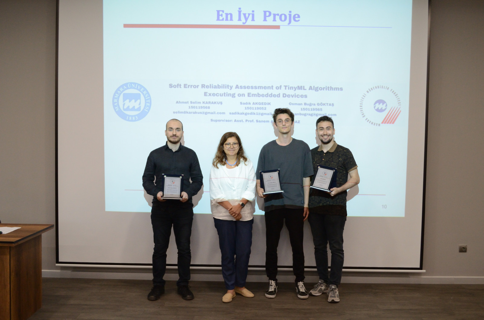 [10/06/24] The graduation project by Sadık Akgedik, Osman Buğra Göktaş, and Ahmet Selim Karakuş, titled “Soft Error Reliability Assessment of TinyML Algorithms Executing on Embedded Devices,” supervised by Dr. Sanem Arslan Yılmaz, has been recognized as the Best Project in the Computer Engineering Department at Marmara University for 2024. Congratulations!