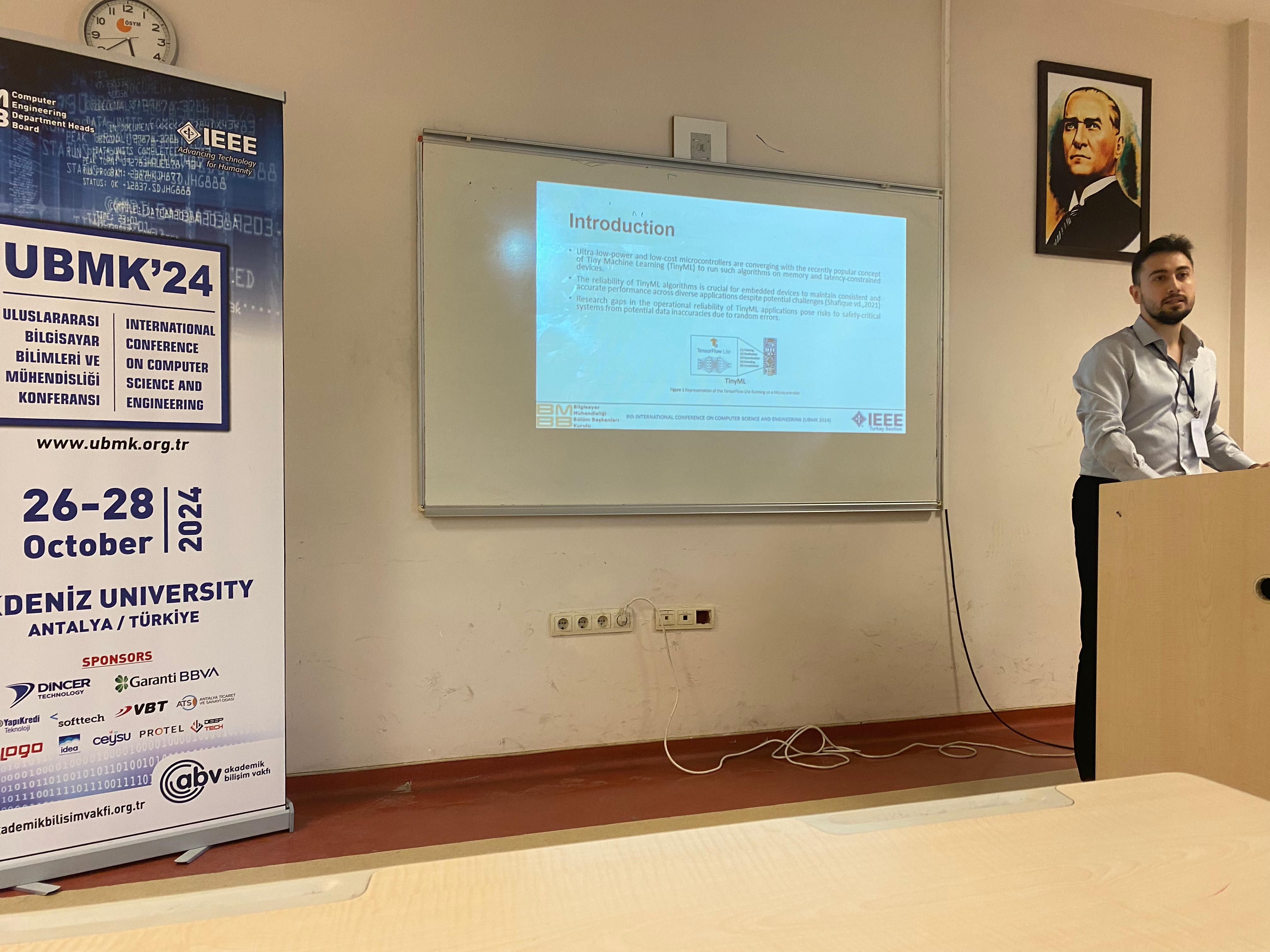 [10/06/24] Sadık, Selim, and Sanem attended the UBMK 2024 Conference in Antalya, Türkiye, where Sadık presented our study titled “Soft Error Reliability Assessment of TinyML Algorithms on STM32 Microcontroller.”